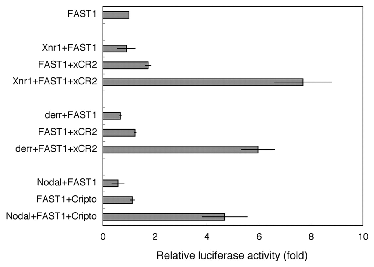 Fig. 3. XCR2 facilitates XNR1 and derrière signaling. 293T cells were transiently transfected with the A3-lux luciferase reporter. Luciferase activity was normalized to the activity of co-transfected β- galactosidase and then expressed as the fold difference in activity relative to that of FAST1 transfection. The average of three independent examinations in triplicate is shown. Error bars show s.d. |