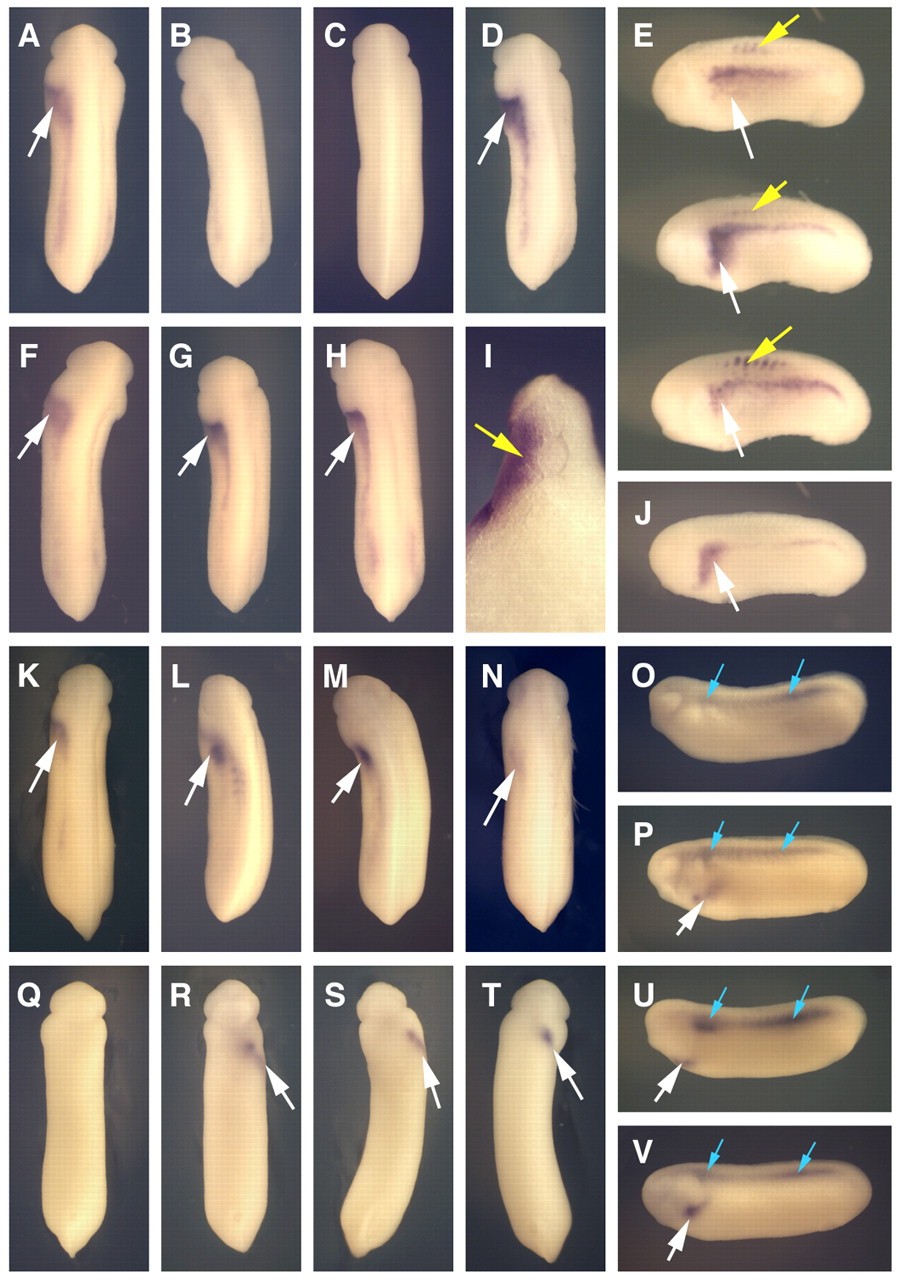 Fig. 6. Left-side injection of XCR2 MO inhibits XNR1 and XATV expression in the lateral plate mesoderm (LPM). (A-N) In situ hybridization of XNR1. White arrows indicate the expression of XNR1 in the LPM. (A) Embryo injected with 10 ng of SC MO into the left side, showing normal XNR1 expression. (B) Injection of 10 ng of XCR2 MO into the left side caused no expression of XNR1 in the LPM. (C) Co-injection of 10 ng of XCR2 MO with 10 pg of pCS-EGFP plasmid into the left side caused no expression of XNR1 in the LPM. (D,E,I) Co-injection of 10 ng of XCR2 MO with 10 pg of pCS-XCR2 plasmid into the left side rescued the expression of XNR1 in the LPM and also caused ectopic XNR1 expression in the somite (yellow arrows). (I) Transverse section of the rescued embryo. Ectopic XNR1 expression in the somite was observed. (F,G) Right-side injection of 10 ng of SC MO (F) or XCR2 MO (G) did not affect XNR1 expression. (H,J) Uninjected control embryo. (K-N) Co-injection of 10 ng of XCR2 MO with 10 pg of XCR1 (K), XCR3S (L), XCR3L (M) or human CFC1 (N) plasmid in the left side rescued the expression of XNR1 in the LPM. (O-V) In situ hybridization of XATV in ventral view. Arrows indicate the expression of XATV in the left LPM (white) and the dorsal midline (blue). (O,Q) Embryo injected with 10 ng of XCR2 MO in the left side inhibited the expression of XATV in the left LPM, but not in the dorsal midline. (P,R) Embryo injected with 10 ng of XCR2 MO in the right side, showing normal XATV expression. (S,U) Co-injection of 10 ng of XCR2 MO with 10 pg of pCS-XCR2 plasmid in the left side rescued the expression of XATV in the left LPM. (T,V) Uninjected control embryo. |