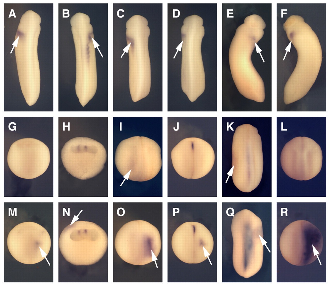 Fig. 8. Right-side overexpression of XCR2 causes left-right inverted gene expression. (A-D,G-I,M-O) In situ hybridization of XNR1 in dorsal view (A-D,G,I,M,O), anterior side at top, and in side view of a half-dissected embryo (H,N). (E,F,J,K,P,Q) In situ hybridization of XATV in ventral view (E,F) and in dorsal view (J-K,P,Q). (L,R) In situ hybridization of XCR2 in dorsal view. (A,G-H) Embryo injected with 40 pg of pCS-EGFP plasmid in the right side. (B,M-R) Embryo injected with 40 pg of pCS-XCR2 into the right side. (A,E) Embryo showing normal expression of XNR1 (A) or XATV (E) in the left LPM (arrow) at stage 25/26. (B,F) Right-side XCR2 overexpression caused right-side expression of XNR1 (B) or XATV (F; arrow), and suppressed the left-side expression at stage 25/26. (C,D) Injection of 40 pg of pCS-XCR2 mEGF (C) or pCS-XCR2 mCFC (D) into the right side did not affect the expression pattern of XNR1 (arrow) at stage 25. (G-L) Embryos injected with pCS-EGFP plasmid in the right side. XNR1 expression was not detected in the LPM at stage 15 (G) and stage 16 (H), but was detectable at stage 20 (I) (arrow). XATV expression was not detected in the LPM at stage 17 (J), but was detectable at stage 23 (K; arrow). XCR2 was expressed broadly at stage 20 (L). (M-R) Embryo injected with pCS-XCR2 plasmid in the right side. XNR1 expression was ectopically expressed in the right LPM at stage 15 (M) and stage 16 (N), in addition to posterior bilateral expression. Strong XNR1 expression was detected on the right side (arrow), but not on the left side at stage 20 (O). Ectopic XATV expression (arrow) was detected in the right LPM at stage 17 (P). XATV expression was detected on the right side (arrow), but not on the left side at stage 23 (Q). Left-side expression of XCR2 was not affected, but very strong expression was detected on the right (injected) side at stage 20 (R). |