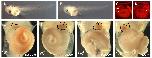 Fig. 2. Spatial expression patterns of Xenopus EGF-CFC genes. (A) Spatial expression patterns of XCR1, XCR3S and XCR3L at stage 9, as determined by RT-PCR of the animal region (A), the marginal region (M), the vegetal region (V), a mixture of the dissected three parts (+++) and intact whole embryos (W). VG1 was used as a control for dissection. (B-I,K-N) Spatial expression analyses by in situ hybridization for XCR1 (FRL1; B,C), XCR3 (D,E) and XCR2 (F-I,K-N). (B1,D1) Stage 10+ in vegetal view. The dorsal side is up. (C1,E1,F,G) Stage 12 (C,E,F) and stage 15 (G) in dorsal view. The anterior side is up. (B2,C2,D2,E2) Stage 10+ (B,D) and stage 12 (C,E) in lateral view. The anterior side is up and the dorsal side is to the right. (H) Stage 20 in dorsal view. Embryo was cleared with benzyl benzoate/benzyl alcohol. Lines show the left (L) and right (R) dissection model for RT-PCR (J). (I) Transverse bisected embryo at stage 20. (J) RT-PCR of the left lateral region (L), the right lateral region (R) and intact whole embryos (W) at stage 20. XCR2 was expressed bilaterally, whereas XNR1 was expressed on only the left side. (K) Stage 25. Line indicates the section plane shown in M. (L) Stage 30. Line indicates the section plane in N. (M,N) Transverse cut embryos at stage 25 (M) and stage 30 (N). Red arrowheads indicate the expression of XCR2 in the prospective heart region; black arrowheads indicate the dorsal lip; white arrowheads indicate the blastopore. DE, dorsal endoderm; DM, dorsal midline; FP, floorplate; NC, notochord. |