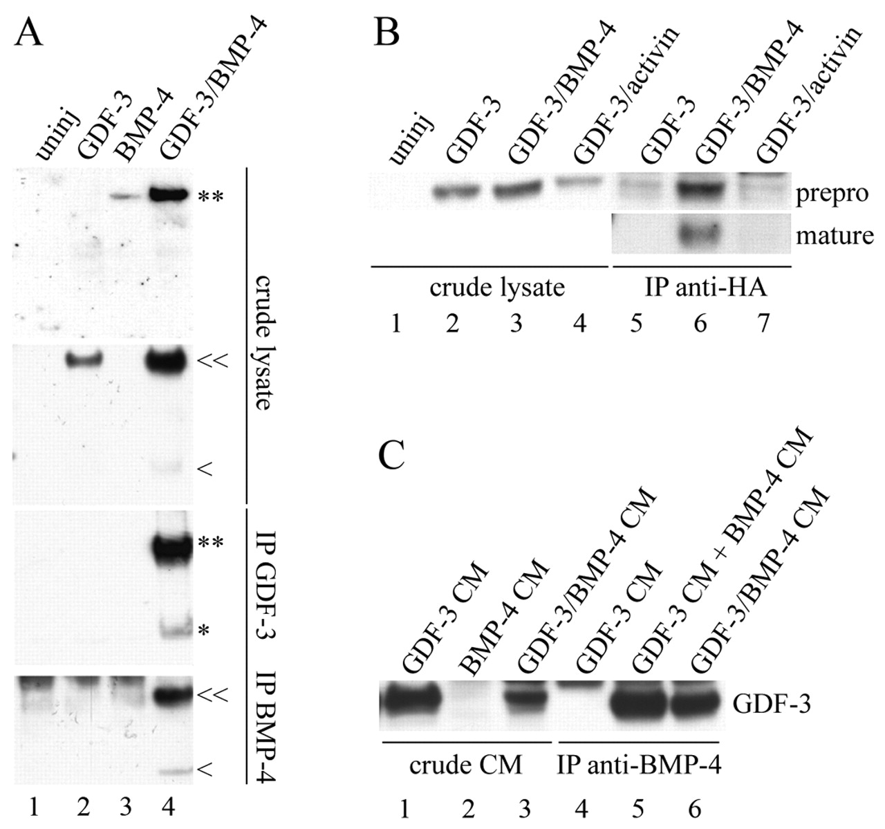 Fig. 3. Immunoprecipitation experiments. (A) Immunoprecipitation of GDF3 and BMP4 from animal caps of frog embryo. First and second panels show 10% crude levels input for immunoprecipitation. Third panel shows immunoprecipitation with FLAG-GDF3, blotted for HA-BMP4; fourth panel shows immunoprecipitation with HA-BMP4, blotted for GDF3. Prepro forms are indicated (**, âª) and mature forms are indicated (*, <). (B) Immunoprecipitation by BMP4-HA or activin-HA using mαHA antibody and blotting with goat αGDF3. The GDF3 prepro (**) form is shown in the upper panel and mature form (*) in the lower panel. (C) Immunoprecipitation of GDF3 by BMP4-HA from CM of COS cells. GDF3 and BMP4 were transfected into separate COS cells (lanes 1,2,4,5) or together in the same COS cells (lanes 3,6). In lane 5, COS CM from separately transfected GDF3 and BMP4 cells was mixed together for the immunoprecipitation. Only the prepro form of GDF3 is shown.