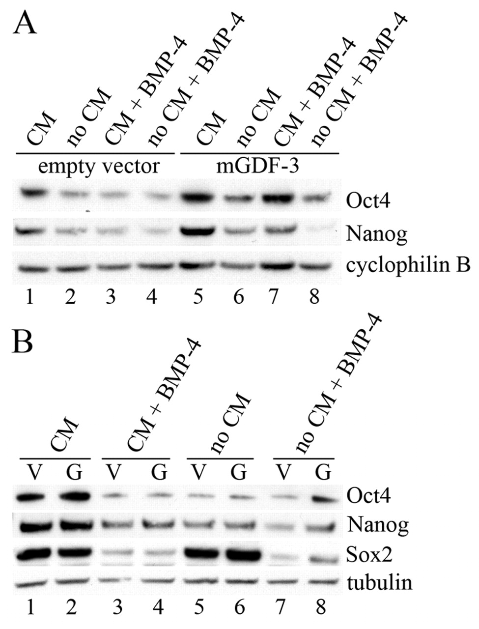 Fig. 4. Protein analysis. Western blot of BGN1 (A) and Jasmine (B) human ES cells transfected with empty vector (V) or Gdf3 (G). Cells were either maintained undifferentiated in CM or cultured in the absence of CM (non CM), with and without rhBMP4 treatment for 3 days. OCT4, NANOG and SOX2 are markers of stemness. Cyclophilin B and tubulin are shown as loading controls.
