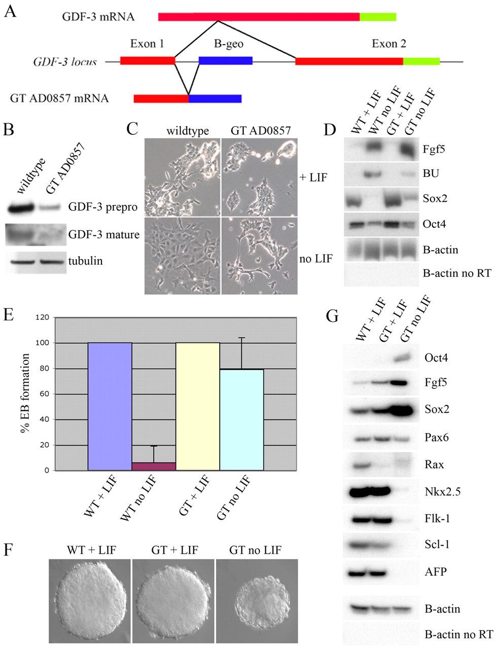 Fig. 5. GDF3 reduction of function through AD0857 genetrap in mouse embryonic stem cells. (A) Diagram of mouse Gdf3 genomic locus containing the AD0857 genetrap. The Gdf3 prepro domain (exon 1 and most of exon 2) is shown in red, GDF3 mature (exon 2) is shown in green, and the genetrap insertion is shown in blue. The RACE Tag for the genetrap contains most of exon 1 of GDF3. (B) Western blot of wildtype (WT) and AD0857 genetrap (GT) ES cells with pαGDF3 (top panel, prepro GDF3; middle panel, mature GDF3) and mαtubulin (bottom panel). (C) Morphology of WT and GT ES after 4 days of culture in the presence or absence of LIF (Ã10). (D) RT-PCR of WT and GT ES after 4 days of culture in the presence or absence of LIF. FGF5 is a marker of pluripotent epiblast. BU is a marker of mesoderm. SOX2 and OCT3/4 are markers of the undifferentiated state. β-actin is used as a loading control. (E) Graph showing the percentage of hanging drops containing cells of each condition (WT and GT with and without LIF) that formed EBs. (F) Day 2 EBs for wild-type cells cultured in the presence of LIF, and genetrap AD0857 cells cultured in the presence or absence of LIF (Ã10). (G) RT-PCR of markers for early embryonic cell fates on day 7 suspension culture EBs. The following markers were used: OCT4 (stem/epiblast), FGF5 (epiblast), SOX2 (stem/epiblast/neural precursor), PAX6 (neural), RAX (anterior neural), NKX2.5 (cardiac mesoderm), FLK1 (endothelial mesoderm), SCL1 (blood), AFP (endoderm), β-actin (loading control). No RT control is shown forβ -actin.
