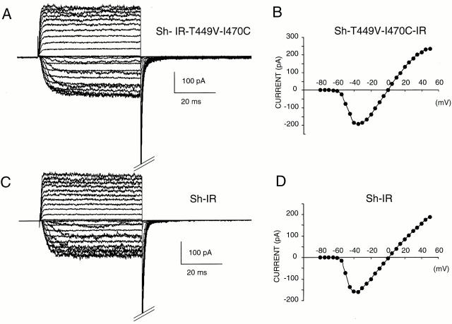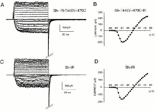 Figure 4. Kinetics and current-voltage relationships are practically indistinguishable in Sh-IR-T449V-I470C and Sh-IR during short depolarizations. K+ current families from oocytes expressing (A) the double mutant Sh-IR-T449V-I470C and (C) Sh-IR evoked by 40 ms pulses ranging from −80 mV to + 50mV in 5-mV increments, from a holding potential of −90 mV. The corresponding IV curves are shown in B and D. |