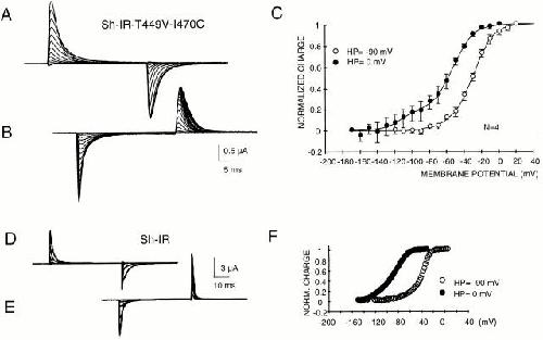 Figure 5. In Sh-IR-T449V-I470C and in Sh-IR, long depolarizations produce a change in the voltage dependence of charge movement. Gating currents recorded in NMG-MES solution from K+-depleted oocytes using the cut-open oocyte voltage clamp technique. (A) Gating currents from Sh-IR-T449V-I470C recorded from −90-mV holding potential during voltage steps from −120 to 20 mV in 10-mV increments (SHP = −120 mV; P = −4). (B) Gating currents from the same oocyte recorded from 0-mV holding potential and during hyperpolarizations ranging from −10 to −170 mV in −10-mV increments (SHP= 0 mV, P = −6). The plot in C shows the time integral of the ON gating currents (QV curve) for the two holding potentials (HP = 0 mV, •, and HP = −90 mV, ○). D and E show unsubtracted gating currents from Sh-IR in identical conditions as in A and B. The corresponding QV curves showed in F illustrate the shift to more negative potentials of the QV from slow inactivated channels (HP = 0 mV, •, HP = −90 mV, ○). |