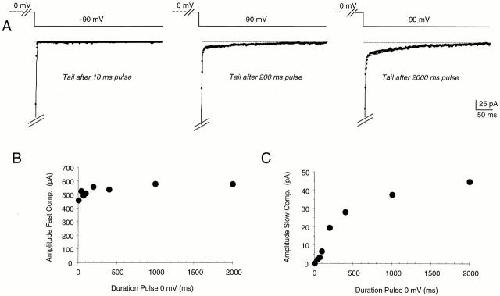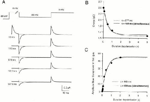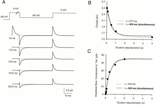 Figure 7. Two components in the tail current of Sh-IR-T449V-I470C. After conditioning depolarization to 0 mV for 0.01, 0.04, 0.07, 0.1, 0.2, 0.4, 1.0, and 2.0 s, the decaying phase of the tail currents at −90 mV were simultaneously fit to the sum of two exponential functions with the constraint that the two time constants were maintained in all traces. (A) Shows tail currents recorded after 10-, 200-, and 2,000-ms pulses to 0 mV with the respective fit superimposed. The fast and slow time constants common to all tail currents were 1.1 and 141.4 ms, respectively. The plot in B shows that the amplitude of the fast component (τ = 1.1 ms) remained practically unchanged with the different pulse duration. On the other hand, the amplitude of the slow component (τ = 141.4 ms; C) increased with the duration of the depolarization, whereas it was practically undetectable for the shortest depolarization (10 ms). |