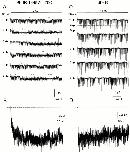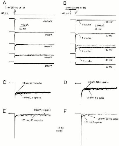 Figure 10. Single channel properties during deactivation in Sh-IR. The records (cell attached patch configuration) show the single channel activity at −90 mV sampled after a depolarization to 0 mV for 50 ms (A) and for 1,000 ms (B). The pulse protocol is shown above the records. Note that during repolarization, the channel activity ceased rapidly when the membrane potential returns to −90 mV for short and long pulses. Currents were sampled at 5 kHz and filtered at 1kHz. |