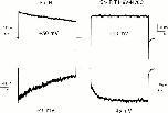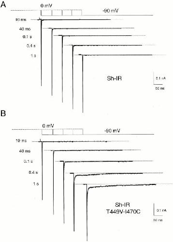 Figure 6. The deactivation rate of Sh-IR-T449V-I470C depends on the duration of depolarizations. The top panel shows K+ tail currents from an oocyte expressing Sh-IR during repolarization to −90 mV. The tail currents are recorded after depolarizations to 0 mV of increasing duration (the duration of the preceding pulse to 0 mV is shown next to the traces). Note that the duration of the conditioning depolarization does not affect the rate of deactivation. In the bottom panel, the same experiment as in A but from an oocyte expressing Sh-IR-T449V-I470C. The tail currents show the appearance of a slow component that progressively increases with pulse duration. |