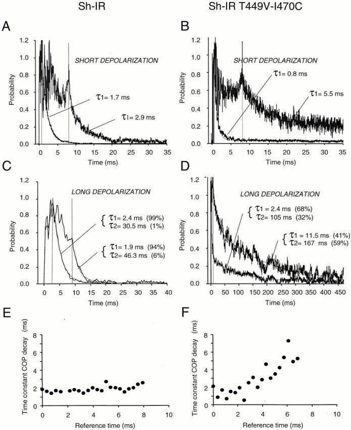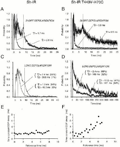 Figure 13. A second open state of Sh-IR-T449V-I470C revealed by conditional open probability. A–D are COP (P(t2|t1)) plots computed from ensemble of ionic tail currents using to the equation P(t2|t1) = C(t1,t2)/iI(t1) + I(t2)/Ni, where C(t2|t1) is the autocovariance function, I(t) is the mean current, and “i” and “N” are obtained from the mean-variance analysis shown in Fig. 12. The conditional open probability at −100 mV at reference times t1 = 0.5 and 8 ms, after a 40- ms depolarization to 30 mV, is shown for Sh-IR (A) and for Sh-IR-T449V-I470C (B). In both clones, the decays of the COP after short depolarizations (A and B) were well fitted by a single exponential function (continuous line). The time constants of the COP decay are reported in the plot. The decay of COP at −100 mV after long depolarization (300 ms) are shown in C for Sh-IR and in D for Sh-IR-T449V-I470C. Data in C and D are fitted to a sum of two exponential functions. The results of the fitting are shown in the panels. Note that, even after long depolarizations, the COP in Sh-IR decays practically monoexponentially (C) for both reference times. On the contrary, the COP in Sh-IR-T449V-I470C decays biexponentially (D). The plots in E and F show the relationship between the time constant of the COP decay with the reference time. In Sh-IR-T449V-I470C, after short depolarizing pulses, the time constant of conditional open probability decay increases quickly as a function of t1 and pulse duration (F), an indication of the presence of more than one open state. In Sh-IR (E), the time constant of the decay is practically independent from the reference time chosen. |