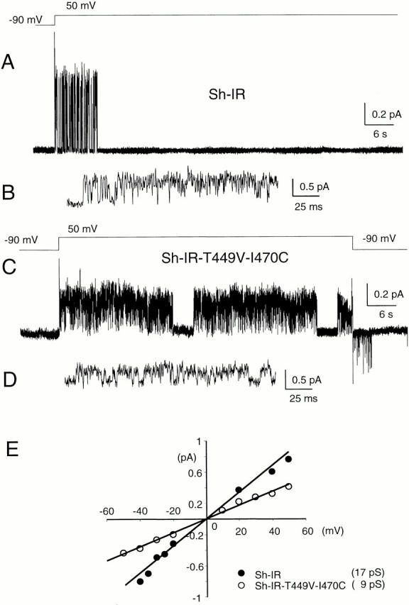 Figure 2. Single channel activity of Sh-IR and Sh-IR-T449V-I470C at +50 mV. Cell-attached patch recordings from oocytes expressing Sh-IR (A and B) and Sh-IR-T449V-I470C (C and D). From a holding potential of −90 mV, the membrane patches containing a single channel were depolarized to +50 mV for ∼80 s (the pulse protocol is shown above the records). The channel activity in Sh-IR persisted for ∼10 s before the channel fully inactivated (A). In Sh-IR-T449V-I470C (C), the channel activity was sustained throughout the depolarization and persisted for a few seconds after repolarization to −90 mV. The activity of both channels is also shown in an expanded time scale (B and D). Sh-IR was sampled at 10 kHz and filtered at 2 kHz; T449V-I470C was sampled at 5 kHz and filtered at 1 kHz. Long records are shown decimated. (E) Single channel IV plot for Sh-IR(•) and T449V-I470C (○) in symmetrical 120 mM K+. The chord conductance calculated for Sh-IR and T449V-I470C was 17 and 9 pS, respectively. |