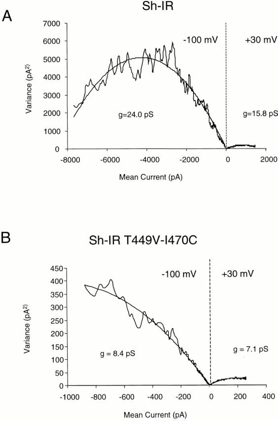 Figure 12. Variance-mean plot in Sh-IR (A) and Sh-IR-T449V-I470C (B). Variance-mean plots taken from an ensemble (n = 201) of current traces recorded in cell attached patch configuration and evoked by 40-ms depolarization to 30 mV, followed by repolarization to −100 mV. Depolarization and repolarization data were fit to the equation: Variance = iI − I2/N, where i represents the single channel current amplitude, I is the mean current, and N is the number of channels; g is the conductance of the single channels. (A and B) are the results for Sh-IR and Sh-IR-T449V-I470C, respectively. The parameters used for the fitting were as follows. Sh-IR at −100 mV, g = 24.0, and POmax 90.2%; at +30 mV, g = 15.8, POmax = 87.3%, and N (at −100 and +30) = 3,538. For Sh-IR-T449V-I470C at −100 mV, g = 8.4, POmax = 42.2%, and N = 2,694; at +30mV, g = 7.1 POmax = 67.0%, and N = 1,380. N was estimated independently for −100 and 30 mV in Sh-IR-T449V-I470C. |