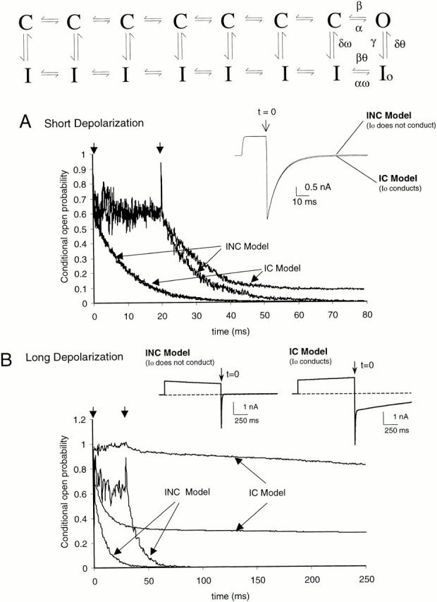 Figure 14. A model for Sh-IR-T449V-I470C. The model is adapted from Olcese et al. 1997, and describes equilibrium properties of slow inactivation in Sh-IR. The rate constants used for the activation pathway were identical to those in Bezanilla et al. 1994. The rate constants leading to and away from the open state (O) are, for the potential −100 mV (in ms−1): α = 11.33, β = 5.23. The voltage independent rate constants of inactivation (γ = 0.00026 ms−1, δ = 4.22 × 10−6 ms−1) and the interaction energy (ln ω = −2.427 kT) are identical to the model of Olcese et al. 1997, except for the additional binding factor θ = 0.01, which was added to slow transitions out of the Io state. (A) Simulated COP decay of tail currents (V = −100 mV) for the case of nonconducting inactivated state (INC), and that of conducting inactivated state (IC), after short depolarizations to 30 mV (20 ms). Two reference times are shown (see arrows) at 0.2 and 20 ms. Data were obtained from 380 groups of 5,000 accumulated runs filtered at 5 kHz, and the COP was computed according to . (B) COP decay after a long depolarization (1 s). Data acquisition is the same as in A, except for filter rate (500 Hz). Reference times (arrows) are 2 and 30 ms. Insets show ionic current for the two models, which are similar for short depolarizations, but diverge for long depolarizations. |