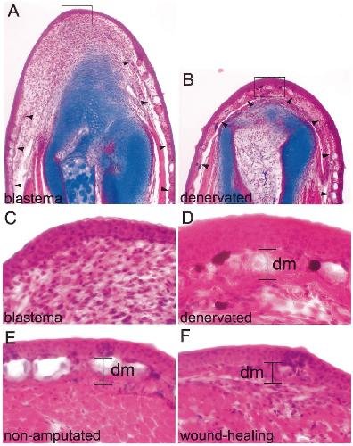 were fixed at 2 weeks after operations. dm; dermis. Note that the blastema in A and C lacks a dermal layer, which is indicated by