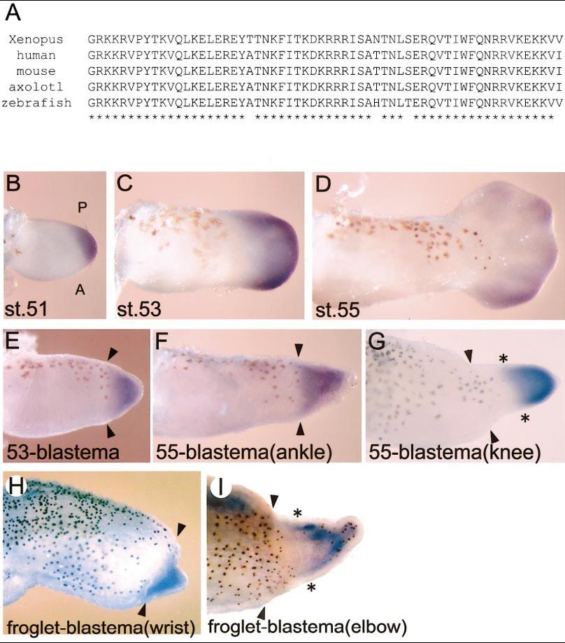 limb buds and blastemas. (B) Developing limb buds at stage 51 (B), stage 53 (C), and stage 55 (D). (E) Regenerating blastemas of the