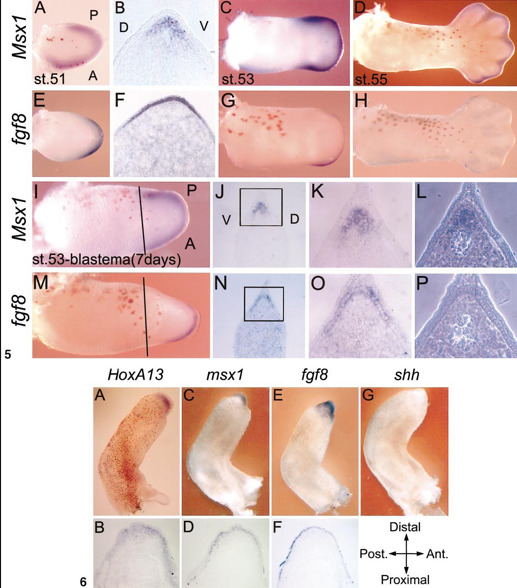 Expression of msx1. (E, M) Expression of fgf8. (A) Developing limb buds. (I) Regenerating blastemas formed on the stage 53 limb