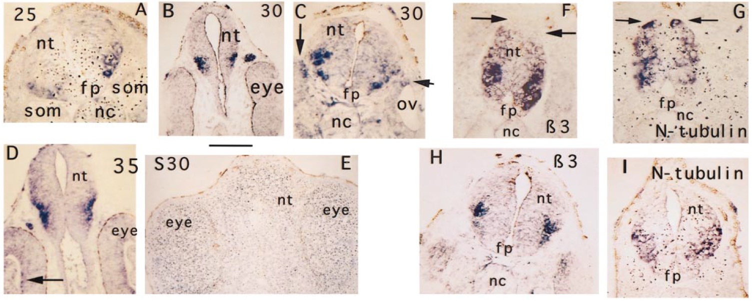between the expression pattern of b3 (F, H) and N-tubulin (G, I) in the spinal cord (F, G) and brain (H, I). Note that only N-tubulin is