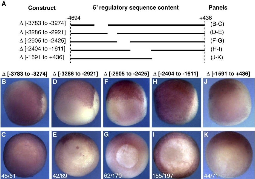 Fig. 3. Internal deletion series confirms the necessity of two 5V regulatory domains. Transgenic embryos carrying the constructs schematized in A were analyzed by in situ hybridization at st. 11.5 for the pattern of reporter expression. (B, D, F, H, J) Side views with posterior to the right and dorsal up. (C, E, G, I, K) Posterior views with dorsal up. (B, J, K) In situ for eGFP. (H, I) In situ for firefly luciferase. (C, E, G, I, K) Numbers represent the fraction of total embryos carrying the indicated construct that displayed the expression pattern shown. |
