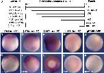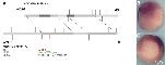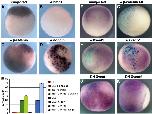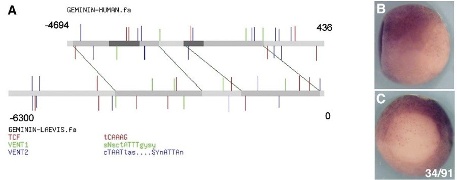 Fig. 7. Conservation of Regulatory Domains. (A) The 5.1 kb of hgem 5V sequence is aligned to 6300 bp of Xgem 5V sequence using WU-BLAST (http:// blast.wustl.edu) (parameters: W = 5, M = 5, N = 3, Q = 10, R = 10). Sequences are represented by gray bars. In hgem, the two regulatory domains are represented by dark gray bars. Aligned sequences between hgem and Xgem are represented by medium-gray bars and linked by green lines marking the ends of the alignments. Putative binding sites for Tcf, XVent1 and XVent2 are labeled by red, green and blue vertical lines, respectively. These putative sites are determined by scanning both sequences against scoring matrices of these transcription factors using the program PATSER (http://ural.wustl.edu) and using cutoff values determined by the program. Locations of lines (above or below the sequences) indicate the orientation of the sites (on forward or reverse strand respectively). Lengths of lines are proportional to the scores of the sites which indicate the strength of the sites. (B, C) Transgenic embryos carrying 5 kb of upstream sequence from Xgem cloned into pRAREeGFP were analyzed at st 11.5 by in situ hybridization for eGFP. (B) side view with posterior to the right and dorsal up. (C) posterior view with dorsal up. Numbers indicate sequence location relative to the transcription start site. |