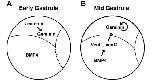 Fig. 8. Model of regulation of early geminin expression. (A) Early gastrula:. Nuclear-localized Beta-catenin is active dorsally. Our data demonstrates that Beta-catenin can activate Xgem and the geminin 5V sequences and that Tcf sites in the geminin regulatory sequences are necessary for geminin expression in dorsal ectoderm at early gastrulation. (B) Mid gastrula: geminin can activate its own transcription. BMP4 activates the transcriptional repressors XVent1 and XVent2. Our data demonstrates that XVent1 and XVent2 sites in the geminin regulatory sequences are necessary to restrict geminin expression to dorsal tissues at mid-gastrulation. We also found that Xgem or geminin regulatory sequences responded negatively to BMP signaling. Schematics are side views of st. 10.5 (A) and st. 11.5 (B) Xenopus gastrulae with posterior facing right and dorsal up. |