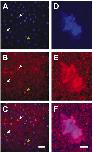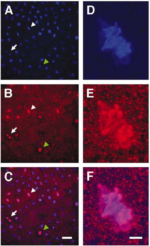 FIG. 1. Immunofluorescence microscopy of a Xenopus embryo stained with anti-phosphohistone H3 antibody (aPH3) at stage 9. The embryo was double-stained with the DNA dye DAPI (A and D, blue) and aPH3 (B and E, red) and observed with confocal microscopy. Merged images are shown in (C and F). (A C) Images at low magnification and (D F) at high magnification. Arrows in (A C) indicate a cell in anaphase, white arrowheads a cell in metaphase, and green arrowhead a cell in prophase/prometaphase. In (D F), individual condensed chromosome arms are clearly seen. Scale bar 5 50 mm (A C), or 5 5 mm (D F).