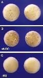FIG. 2. Whole-mount immunostaining by aPH3 after treatment with nocodazole (NOC) and hydroxyurea (HU). Animal pole views of (A) control, (B) NOC-treated, and (C) HU-treated embryos at stage 9. Dark brown dots are aPH3-positive nuclei. A small population of cells in NOC-treated embryos was not stained by aPH3 antibody (2B, arrows), presumably because these cells had just completed the previous mitosis at the start of nocodazole application and had a cell-cycle period longer than the duration of the treatment (2 h).
