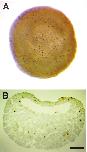 FIG. 3. Xenopus cell division pattern at stage 9. (A) Animal pole view of a whole embryo stained with aPH3 after clearing. Brown dots are mitotic nuclei. (B) Midtransverse section of a stained embryo. Mitotic nuclei appear as brown dots and other nuclei are light green.