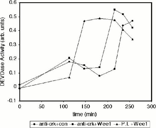 Figure 8. Wee1 signals on a Crk-mediated apoptotic pathway. Egg extracts were depleted with immune complexes formed from polyclonal anti-Crk antisera or preimmune sera bound to protein A–Sepharose (two consecutive depletions; 4°C, 30 min). Recombinant His-tagged Wee1 (10 ng/μl, final concentration) or XB (control) was added to the depleted extracts at a 1:10 dilution (vol/vol). Extracts were incubated at room temperature, and extract samples were taken at the indicated times in order to assay DEVD-pNA cleavage activity. |