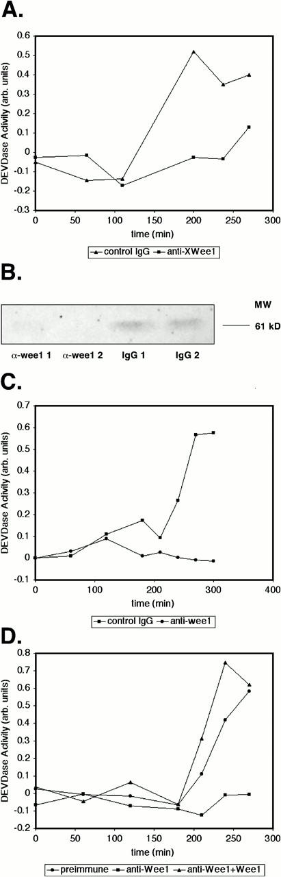 Figure 6. Endogenous Wee1 is required for apoptosis in egg extracts. (A) Egg extracts were depleted of endogenous Wee1 using affinity-purified polyclonal anti-Wee1 IgG; or mock depleted using purified rabbit IgG (control) bound to protein A–Sepharose (two consecutive depletions; 4°C, 30 min). Depleted extracts were incubated at room temperature and subjected to a DEVDase activity assay with extract samples taken at the indicated times. (B) Depletion of endogenous Wee1 was confirmed by Western blot analysis of (2 μl) samples of depleted extracts using the polyclonal Wee1 antibody for protein detection. The numbers 1 and 2 represent the first or second rounds of depletion, respectively. (C) The affinity-purified polyclonal anti-Wee1 IgG or control IgG was added (50 ng IgG/μl extract) at a 1:10 (vol/vol) dilution. These extracts were supplemented with energy-regenerating cocktail, incubated at room temperature, and subjected to a DEVDase activity assay with extract samples taken at the indicated times. (D) Affinity-purified anti-XWee1 IgG or control rabbit IgG was added to egg extracts (final concentration 20 ng/μl). Recombinant Wee1 (final protein concentration 20 ng/μl) or XB was added to the extracts at 1:10 (vol/vol) dilution. These extracts were subsequently treated with an energy-regenerating cocktail and incubated at room temperature. Extract samples (3 μl) were taken at the indicated times and subjected to a DEVDase assay. |