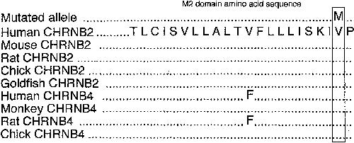 Autosomal dominant nocturnal frontal lobe epilepsy (ADNFLE) is an uncommon, idiopathic partial epilepsy characterized by clusters of motor seizures occurring in sleep. We describe a mutation of the beta2 subunit of the nicotinic acetylcholine receptor, effecting a V287M substitution within the M2 domain. The mutation, in an evolutionary conserved region of CHRNB2, is associated with ADNFLE in a Scottish family. Functional receptors with the V287M mutation are highly expressed in Xenopus oocytes and characterized by an approximately 10-fold increase in acetylcholine sensitivity. CHRNB2 is a new gene for idiopathic epilepsy, the second acetylcholine receptor subunit implicated in ADNFLE.
