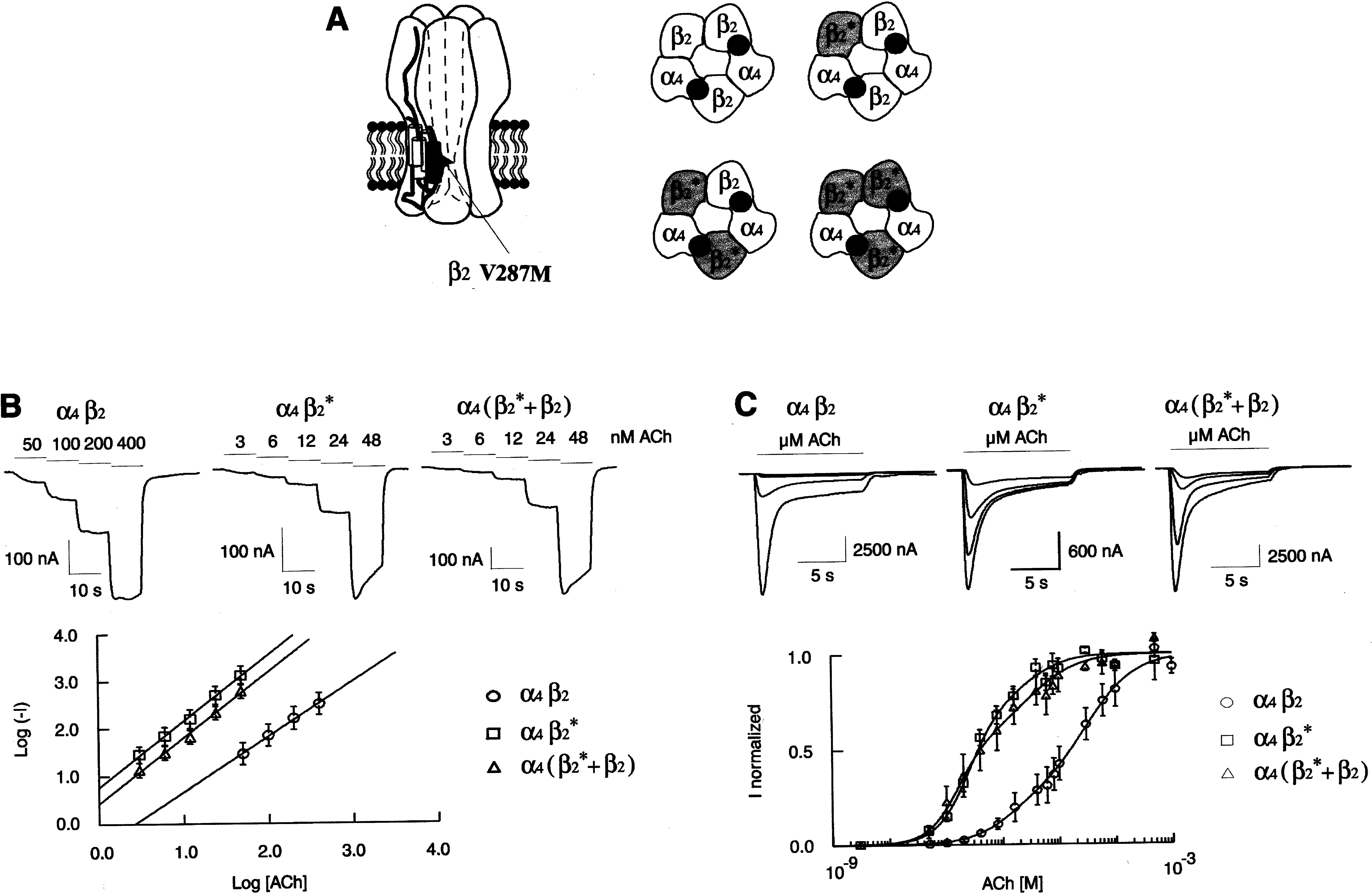 Figure 4. A, left panel, Neuronal α4β2 heteropentameric receptor resulting from the assembly of two α4 and three β2 subunits. Right panel, α4β2 is shown as a pentamer with two potential ACh-binding sites. “β2*” identifies the V287M amino acid substitution. The ACh receptor can assemble without any mutated β2 subunit (α4β2 wild-type receptor) or with one, two, or three mutated β2* subunits. B, upper panel, Current traces elicited by consecutive applications of four or five increasing ACh concentrations (horizontal bars). The values above each bar indicate the concentration of ACh applied to the cell. Lower panel, Differences in ACh affinity are emphasized in a log-log plot. The logarithm of the absolute value of the current (measured in the upper panel, Log [−I]) is plotted as a function of the logarithm of ACh concentrations (Log [ACh]). −I and [ACh] are expressed in nA and nM, respectively. Values are mean ± SEM, with n=9 (α4β2), n=17 (α4β2*), and n=10 (α4[β2*+β2]). Solid lines are the best linear regression throughout data points. C, upper panel, Representative macroscopic currents recorded in oocytes expressing either the wild-type or mutated β2 subunit. Currents evoked by four ACh concentrations (0.1, 0.2, 0.8 and 8 μM) are superimposed. Cells were held at −100 mV and challenged with ACh (10 s) once every 120 s. Bars indicate ACh applications. Lower panel, ACh activation curves for α4β2, α4β2* and α4(β2*+β2). Dose-response curves were normalized to the maximal current amplitude of each cell. Values are mean ± SEM. For each ACh concentration, 3–8 independent measurements were averaged. Values of the curve fits are given in the text.