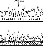 Figure 2. DNA sequence of CHRNB2, showing the c1025G→A transition. The upper chromatogram shows the mutation. The lower chromatogram shows the control sequence.