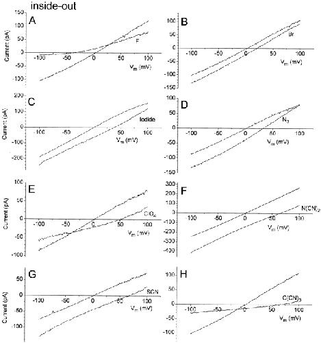 Figure 2. I–V relationships of ICl.Ca in inside-out patches with different cytoplasmic anions. The external solution contained 150 mM NaCl, 10 mM TES, pH 7.2, and 0.1 mM CaCl2. The cytoplasmic solution was shifted between this solution (unlabeled traces) and 150 mM NaX, 10 mM TES, pH 7.2, 0.1 mM CaCl2, where X is the substitute anion (labeled traces). The traces have not been corrected for liquid junction potentials. (A) Fluoride; (B) bromide; (C) iodide; (D) azide; (E) perchlorate; (F) dicyanamide; (G) thiocyanate; and (H) tricyanomethanide (potassium salt). The I–V curves were obtained by voltage ramps from −100 to +100 mV. |