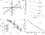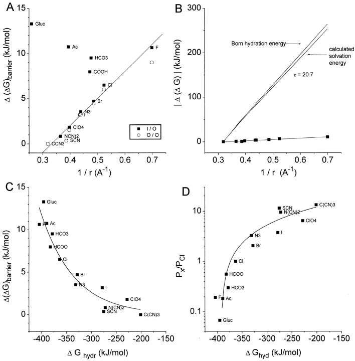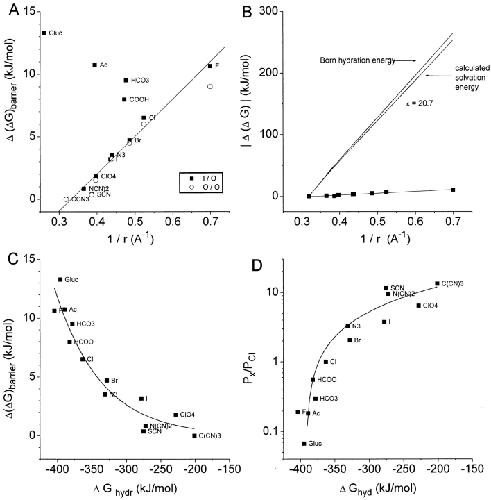 Figure 6. Analysis of anion permeation through ClCaC channels. (A) The relative energy barrier height (Δ(ΔG)barrier) was calculated from the permeabilities relative to C(CN)3 in Fig. 5 using . Δ(ΔG)barrier was plotted versus the reciprocal of the ionic radius of the anion after applying the Lattimer correction (Smith et al. 1999). (Closed squares) Inside-out patches; (open circles) outside-out patches. The line is the best fit to the data points excluding gluconate, acetate, bicarbonate, and formate. (B) Calculation of the effective dielectric constant of the pore. The relative Born hydration energy in water (heavy solid line) was calculated from with ɛ = 80 (water). The line (Δ(ΔG)barrier) through the data points is from A. Relative solvation energy (thin line) was calculated by subtracting the fit to the data points from the heavy line. (C) Δ(ΔG)barrier versus measured free energies of hydration. Hydration free energies were obtained from Marcus 1997 or were extrapolated from potentiometric measurements (Smith et al. 1999). (D) Relative permeabilities versus hydration free energy. |