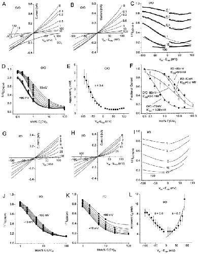 Figure 7. ICl.Ca block by C(CN)3. (A–E) Outside-out patch with C(CN)3 on the extracellular face. (G–L) Inside-out patch with C(CN)3 on the cytoplasmic side. The bath solutions contained 10 mM TES, pH 7.2, 0.1 mM CaCl2, and 150-mM mixtures of NaCl and KC(CN)3. The pipet contained the same solution with 150 mM NaCl. The patch was voltage-clamped with a 250-ms duration voltage ramp from −100 to +100 mV. (A) I–V relationships in outside-out patches with the following external mol% C(CN)3 (the balance being Cl) as marked: 0, 0.1, 0.2, 0.5, 1, 10, and 100. The line marked “SO4” is the I–V curve obtained with Cl replaced with SO4 on the external side to evaluate leak. (B) The I–V curves in A were replotted versus the driving force (Vm− Erev) for each anion mixture. (C) Voltage-dependent block of ICl.Ca by C(CN)3. (Heavy lines) Each curve in B was divided by the curve obtained in 100 mol% Cl. (Light lines) Fit of the data to (see text). (D) Concentration- and voltage-dependent block of ICl.Ca. The data in C were replotted for various potentials as a function of mol% C(CN)3. The data were fitted to the logistic equation: I/IC(CN)3 = 0 = Imin + {(Imax – Imin) / 1 +([C(CN)3] /Kd)n} (solid lines). (E) Apparent Kd of extracellular C(CN)3 as a function of voltage. The apparent Kd at each voltage was determined from the fits in D in four separate experiments and averaged. (F) Inhibition of the current in both inside-out and outside-out patches as a function of mol% C(CN)3. The current was measured at +80 and −80 mV of driving force. The current relative to that in 100% Cl was plotted versus [C(CN)3]. (Squares) Outside-out patches; (circles) inside-out patches; (open symbols) −80 mV; and (closed symbols) +80 mV. (G) I–V relationships for inside-out patches with the following cytoplasmic mol% C(CN)3 (the balance being Cl) as marked: 0, 1, 2, 5, 10, 25, and 100. (H) The I–V curves in G were replotted versus the driving force (Vm− Erev) for each anion mixture. (I) Voltage-dependent block of ICl.Ca by C(CN)3. Each curve in H was divided by the curve obtained in 100 mol% Cl. (J and K) Concentration- and voltage-dependent block of ICl.Ca. The data in I were replotted for various potentials as a function of mol% C(CN)3. The data were fitted to the logistic equation (solid lines). (L) Apparent Kd of cytoplasmic C(CN)3 as a function of voltage. The apparent Kd at each voltage was determined from the fits in J and K for four separate experiments and averaged. |