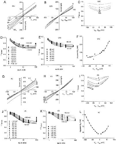 Figure 8. ICl.Ca block by SCN. (AâF) Outside-out patch with SCN on the extracellular face. (GâL) Inside-out patch with SCN on the cytoplasmic side. Bath solutions contained 10 mM TES pH 7.2, 0.1 mM CaCl2, and 150-mM mixtures of NaCl and NaSCN. The pipet contained the same solution with 150 mM NaCl. The patch was voltage-clamped with a 250-ms duration voltage ramp from â100 to +100 mV. (A) IâV relationships with the following external mol% SCN (the balance being Cl) as marked: 0, 1, 2, 5, 10, 25, and 100. (B) The IâV curves in A were replotted versus the driving force (Vmâ Erev) for each anion mixture. (C) Voltage-dependent block of ICl.Ca by external SCN. Each curve in B was divided by the curve obtained in 100 mol% Cl. (D and E) Concentration- and voltage-dependent block of ICl.Ca. The data in C were replotted for various potentials as a function of mol% SCN. The data were fitted to the logistic equation (solid lines). In D, the data points at 100 mol% SCN were ignored in fitting the curves. This experiment is representative of three experiments. (F) Apparent Kd of extracellular SCN as a function of voltage. The apparent Kd at each voltage was determined from the fits in D and E. (G) IâV relationships with the following cytoplasmic mol% SCN (the balance being Cl) as marked: 0, 1, 2, 5, 10, 25, and 100. (H) The IâV curves in G were replotted versus the driving force (Vmâ Erev) for each anion mixture. (I) Voltage-dependent block of ICl.Ca by cytoplasmic SCN. Each curve in H was divided by the curve obtained in 100 mol% Cl. (J and K) Concentration- and voltage-dependent block of ICl.Ca. The data in I were replotted for various potentials as a function of mol% SCN. The data were fitted to the logistic equation (solid lines). In J, the data points at 100 mol% SCN were ignored in fitting the curves. This experiment is representative of five experiments. (L) Apparent Kd of cytoplasmic SCN as a function of voltage. The apparent Kd at each voltage was determined from the fits in J and K. |