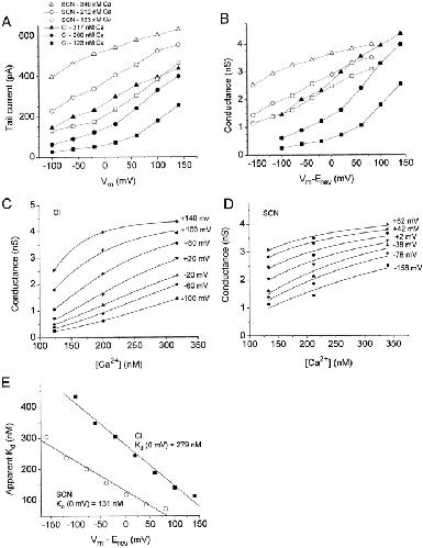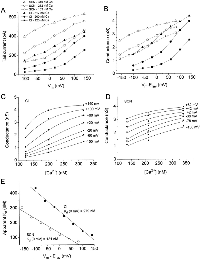 Figure 11. Calcium dependence of ICl.Ca with Cl or SCN as permeant anion. (A) Tail currents versus voltage. The instantaneous tail currents at â100 mV in Fig. 10 were plotted versus voltage for each condition (open symbols, SCN; closed symbols, Cl; [Ca2+] as indicated). (B) Conductance versus voltage. The conductance of the traces in Fig. 10 was determined by measuring the amplitudes of the instantaneous tail currents at â100 mV and dividing by the driving force (Vmâ Erev). Erev was shifted +58 mV in SCN compared with Cl. (C) Conductance versus free [Ca2+] at various potentials with Cl as permeant anion. The data were fitted to the Boltzmann equation: G = Gmin â [(Gmax â Gmin) / 1 + e([Ca]âKd)/s], where Gmax and Gmin are the maximum and minimum conductances, respectively, and s is the slope factor. Gmax was fixed at 4.46 nS for Cl and 4.54 nS for SCN, and Gmin was fixed at 0. Gmax was chosen by preliminary fitting sessions using the data from the most positive potentials and allowing all variables to float. Our previous extensive study on the voltage dependence of ICl.Ca (Kuruma and Hartzell 2000) justified using the same Gmax for all voltages. Because of problems with rundown of ICl.Ca in excised patches (Kuruma and Hartzell 2000), we were able to test only a limited number of [Ca2+] before rundown exceeded 10%. This limited the number of data points we had available for fitting. (D) Conductance versus free [Ca2+] at various potentials with SCN as the permeant anion. (E) Apparent Kd for Ca2+ is different in the presence of Cl and SCN. The apparent Kd was extracted from the Boltzmann fits in C and D and plotted versus membrane potential. These data are typical of four experiments. |