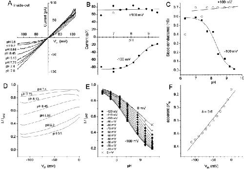 Figure 12. Dependence of ICl.Ca on cytoplasmic pH. An inside-out patch was exposed to bath solutions composed of 150 mM NaCl, 0.1 mM CaCl2, and 10 mM HEPES, adjusted to pH between 6.3 and 9.5 with NaOH. The pipet contained the same solution at pH 7.0. The patch was voltage-clamped by a ramp from −120 to +120 mV. (A) I–V relationship for pH 7.0, 7.4, 7.75, 8.13, 8.45, 8.88, 9.2, and 9.5. (B) Amplitude of the current at +100 mV (circles) and −100 mV (squares) for the traces shown in A and also pH 6.3. (C) Slope conductance measured between −100 and −120 mV (closed squares) or between +100 and +120 mV (open circles). (D) Voltage dependence of pH block. The currents at each pH in A were divided by the current at pH 7.0 and plotted versus membrane potential. (E) pH- and voltage-dependent block of ICl.Ca. The data in D was replotted versus pH. (F) Apparent pKa versus Vm. The apparent pKa of current block was determined from the fits to the data in E and plotted versus membrane potential. This experiment is typical of eight experiments. |