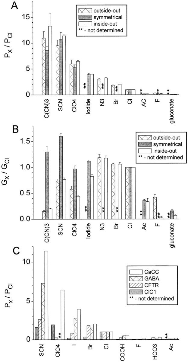 Figure 5. Comparison of permeabilities and conductances. (A) Relative permeabilities. (B) Relative conductances. (Open bars) Inside-out patches with changes in cytoplasmic solution (n = 3–5). (Cross-hatched bars) Outside-out patches with changes in external solution (n = 3–4). (Closed bars) Inside-out patches with substitute anion on both sides of the membrane was compared with Cl on the cytoplasmic side (n = 3–6). (C) Comparison of Px/PCl in different anion channels. ClCaC (open bars; data from this paper); GABAA receptor (cross-hatched bars; data from Bormann et al. 1987); CFTR (slant-hatched bars; data from Linsdell and Hanrahan 1998); and ClC-1 (closed bar; data from Rychkov et al. 1998). |