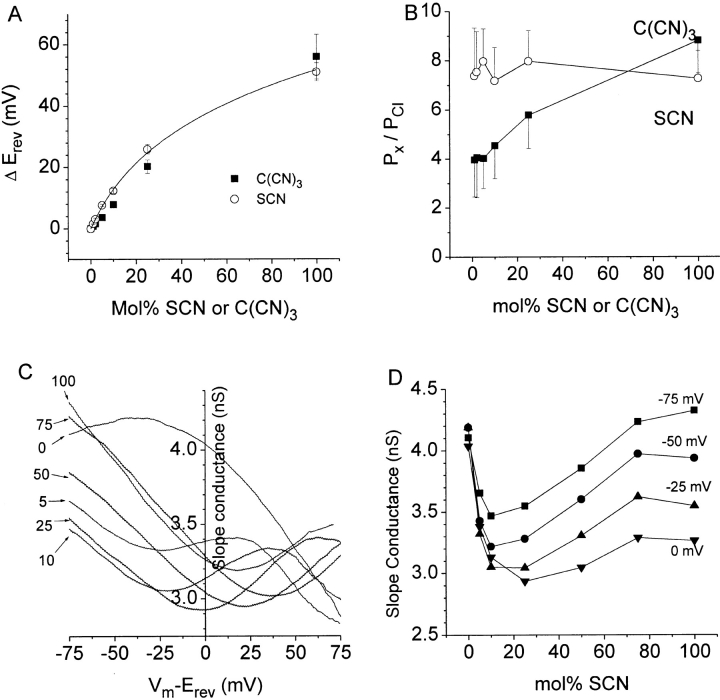 Figure 9. Anomalous mole fraction behavior of ClCaCs. (A) Dependence of Erev on mol% C(CN)3 or SCN. The Erevs corrected for liquid junction potential obtained from experiments such as those in Fig. 7 and Fig. 8 were plotted versus mol% of the substitute anion. (Open symbols) SCN, n = 5; (closed symbols) C(CN)3, n = 4. (Solid line) Goldman-Hodgkin-Katz equation with PSCN/PCl = 8. (B) Dependence of permeability ratio on mol% of SCN or C(CN)3. Px/PCl was calculated from the data in A from the form of the Goldman-Hodgkin-Katz equation: Px/PCl = [Clo · (exp (F/RT · ÎErev) â 1) / Xi] +1, where Clo = 150 mM and Xi is the concentration of the substitute anion. (C) Dependence of slope conductance on driving force at different mol% SCN. The slope conductance was determined by calculating the slope of the IâV curve of an inside-out patch like the one in Fig. 8 using a 20-mV moving window. The resulting curves were smoothed by the FFT smoothing algorithm in Origin and the slope conductance was plotted versus the driving force for different mol% SCN (labels to left of curves). (D) Slope conductance versus mol% SCN. The slope conductance for four different voltages in C was plotted versus mol% SCN. The curves show a minimum slope conductance at 10â25 mol% SCN. |