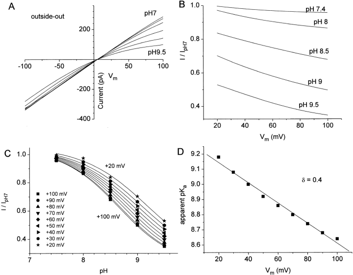 Figure 13. Dependence of ICl.Ca on external pH. An outside-out patch was exposed to bath solutions composed of 150 mM NaCl, 0.1 mM CaCl2, 10 mM HEPES, adjusted to pH between 7.0 and 9.5 with NaOH. The pipet contained the same solution at pH 7.0. The patch was voltage-clamped by a ramp from −120 to +120 mV. (A) I–V relationship for pH 7.0, 7.4, 8, 8.5, 9, and 9.5. (B) Voltage dependence of pH block. The currents at each pH in A were divided by the current at pH 7.0 and plotted versus membrane potential. (C) pH- and voltage-dependent block of ICl.Ca. The data in B was replotted versus pH. (D) Apparent pKa versus Vm. The apparent pKa of current block was determined from the fits to the data in C and plotted versus membrane potential. This experiment is one of two experiments in outside-out configuration and four inside-out experiments in which the solution inside the patch pipet was changed. |