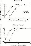 Figure 2. Dose–response curves for rod and olfactory channels demonstrate differential inhibition by DAG. Bath contained low divalent NaCl solution with or without 0.5 μM DAG and various concentrations of cGMP. Steady-state, cGMP-activated currents were measured at +100 mV from a single patch containing either rod or olfactory channels and were normalized to the Imax without DAG. Smooth curves were drawn by fitting the averaged data with the Hill equation, I/Imax = [cGMP]n/(K1/2n + [cGMP]n), where I is the cGMP-activated current, Imax is the cGMP-activated current obtained at saturating cGMP, K1/2 is the concentration of cGMP giving half maximal activation, and n is the Hill coefficient. In fitting the data, this relation was scaled to match the measured maximal I/Imax (e.g., the maximal I/Imax for the rod channel in the presence of 0.5 μM DAG was only 0.71 here, rather than 1). The Hill relation was used only for an empirical description of the data to quantify changes in the apparent affinity and maximal activation (or inhibition; see Fig. 3); it is not meant to suggest a mechanism of channel activation or inhibition by DAG. (A) Rod channels. Top curve (without DAG): I/I max = 1, n = 2.25, and K1/2 = 24 μM. Bottom curve (with DAG): I/I max = 0.71, n = 2.25, and K1/2 = 76 μM. (B) Olfactory channels. Top curve (without DAG); I/I max = 1, n = 2.8, and K1/2 = 1.8 μM. Bottom curve (with DAG): I/I max = 0.97, n = 2.8, and K1/2 = 4.0 μM. |