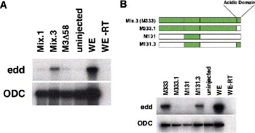 Fig. 6. (A) Animal cap assay demonstrating that truncation of the acidic domain from Mix.3 (M3Δ58) destroys endoderm inducing activity. (B) Schematic diagram of the acidic domain swap mutants. The carboxyl terminal sixty-two amino acids of Mix.3 was swapped onto M131 to generate M131.3 and the carboxyl terminal fifty-nine amino acids of Mix.1 was swapped onto M333 to generate M333.1. Animal cap assays demonstrate that the homeodomain and acidic domain of Mix.3 are sufficient for endoderm induction (M131.3) whereas the acidic domain of Mix.1 is not (M333.1).