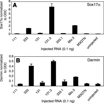 Fig. 7. Induction of early endoderm markers by the Mix swap mutants correlates with the induction of late endoderm markers. RNA (0.1 ng) was injected and animal caps were harvested at stage 11.5. The early endoderm markers, Sox17α (A), and Darmin (B), were detected by real-time PCR and normalized to ODC levels. Error bars represent standard deviation of mean of duplicate reactions. Shown is a representative of three experiments.