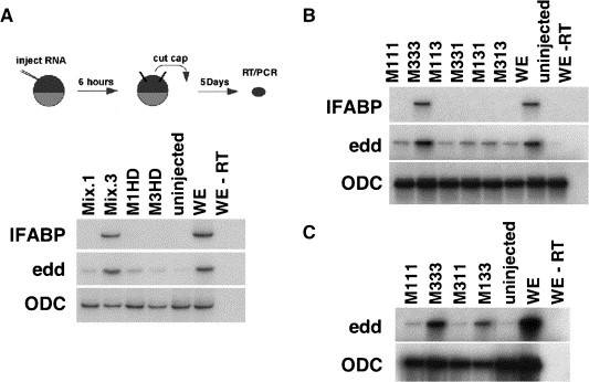 Fig. 2. Animal cap assays of Mix mutants demonstrating that the homeodomain and carboxyl terminus of Mix.3 co-operate to induce endoderm. (A) Schematic diagram of the animal cap assay. Mix mRNA (1 ng) is injected into single cell fertilized embryos and incubated until stage 8. The animal polepresumptive ectoderm is dissected and incubated for five days until sibling stage 36. Total RNA is harvested from the caps, reverse transcribed and endoderm specific genes are PCR amplified. Endoderm genes examined are intestinal fatty acid binding proteins (IFABP), endodermin (edd), and GATA-5. Ornithine decarboxylase (ODC) is a control for RNA recovery. Uninjected caps, whole embryos (WE) and whole embryos minus reverse transcriptase are run in all experiments as controls. Neither Mix.1 nor Mix.3 truncation mutants induce endoderm specific genes in animal cap assays (M1HD, M3HD). (B) Homeodomain and carboxyl termini swap mutants do not induce endoderm genes in animal cap assays (M113, M331, M131 and M313). (C) Homeodomain and carboxyl terminus of Mix.3 are necessary (M133) to induce endoderm genes in animal cap assays.