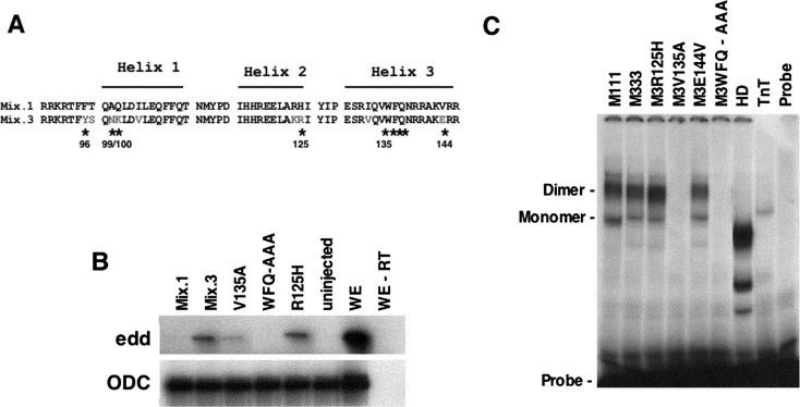 Fig. 4. Mix.1 and Mix.3 homeodomains have very similar amino acid sequences but are not functionally equivalent. (A) Comparison of the Mix.1 and Mix.3 homeodomains. Stars and numbers indicate amino acid residues that were mutated. (B) Animal cap assay of Mix.3 homeodomain mutants. Arginine 125 in Mix.3 was changed to the corresponding residues in Mix.1, histidine (R125H). DNA binding activity was disrupted by changing valine 135 to alanine (V135A) similar to the zebrafish bonnie and clyde mutant. Tryptophan, phenyalanine and aspartic acid (WFQ) were changed to alanines to disrupt the DNA binding of helix 3 (WFQ-AAA). (C) Electrophoretic mobility gel shift assay of in vitro transcribed and translated homeodomain mutants. The Mix binding site P3 (TAATTGAATTA) was used for a probe. HD is the Mix.1 homeodomain and TnT contains rabbit reticulocyte lysate transcription/translation reaction without Mix cDNA.