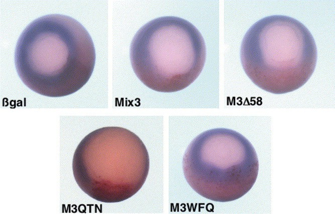 Fig. 9. Embryos were injected in one blastomere at the two cell stage with Mix.3 mRNA constructs (0.5 ng) together with β-galactosidase as a lineage tracer, Mix.3, M3Δ58, M3QTN, M3WFQ and β-galactosidase alone. Embryos were fixed at stage 11 and stained with Red-gal (red stain=β-gal) and then subjected to in situ hybridization for Xbra expression (blue stain=Xbra).