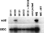 Fig. 3. The homeodomain and carboxyl terminus of Mix.3 must be on the same protein to co-operate. Mutants containing the Mix.3 homeodomain (M131) and the carboxyl terminus (M313) were co-injected into embryos for animal cap assays. The mutants alone or together are unable to induce endodermin indicating that the Mix.3 homeodomain and the Mix.3 C-terminus must be present on the same polypeptide.