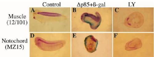 one side of the embryo only; E, radial injection). In B,E, visualisation of the β-gal positive cells (blue X-gal staining) reveals that the inhibition of muscle and notochord development is restricted to the cells that have received the exogenous mRNA. (C,F) Embryos treated with 100 μM LY2941002 from stage 9 to stage 12.5. |