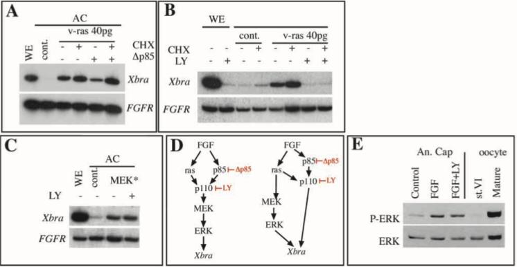 Fig. 5. Position of PI3K in the FGF signalling cascade. (A) Embryos uninjected or injected at the two cell-stage animally with the indicated combination of 40 pg/blastomere of Ras (v-ras) mRNA and/or 1 ng of âp85 mRNA were incubated with cycloheximide (CHX, 10 μg/ml) from stage 7 onwards where stated. Animal caps were excised at stage 8 and frozen at stage 10 for RT-PCR analysis of Xbra expression.