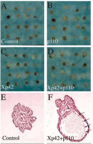 Fig. 6. Activated ERK and p110 synergise during mesoderm induction in animal caps. (A-D) Whole-mount photography of stage 37/38 animal caps explanted at stage 9 from control embryos (A), embryos injected with 250 pg of mRNA for p110caax, a membrane- targeted form of the p110α class 1A PI3K (B), embryos injected with 200 pg of mRNA for Xp42D324, an activated form of ERK (C) or embryos co-injected with both mRNAs (D). (E,F) Histological staining of sectioned animal caps at stage 37/38. (E is a control cap; the cap in F expresses activated ERK and p110α). Τhe presence of a large fluid-filled cavity lined with mesothelial cells (arrows) is characteristic of ventral mesoderm differentiation (Smith, 1993). This analysis did not reveal significant difference between the mesodermal types induced by the different mRNA injections. |